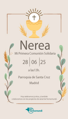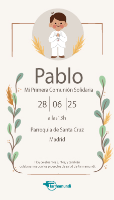 Haz que la comunión de tu hijo o hija sea aún más especial con nuestros tarjetones solidarios personalizados. Un detalle pensado para agradecer a tus invitados y para sumar un gesto solidario, colaborando con los proyectos de salud de Farmamundi.